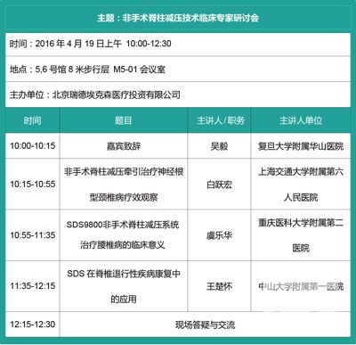 瑞德醫療將于2016年4月19日上午在5,6號館8米步行層 M5-01會議室舉辦“非手術脊柱減壓技術”臨床專家研討會。